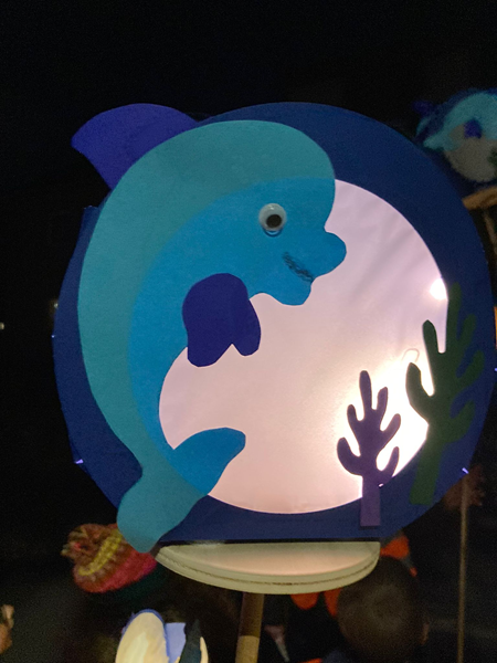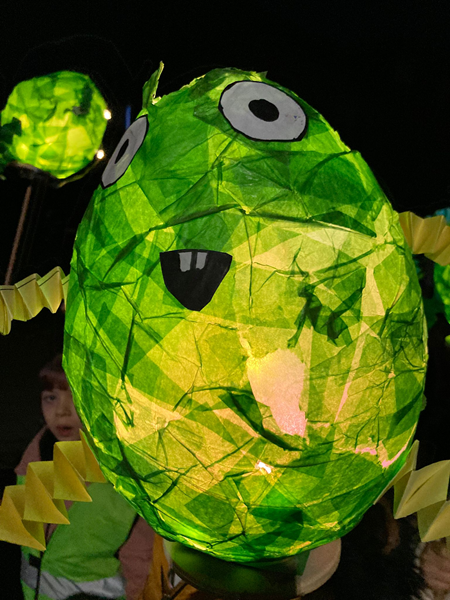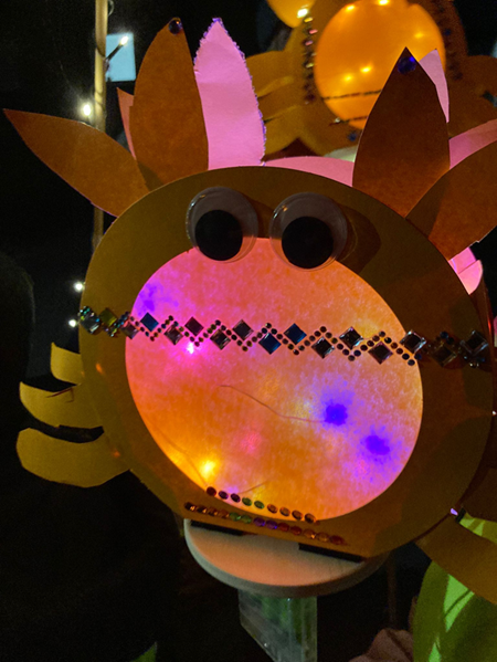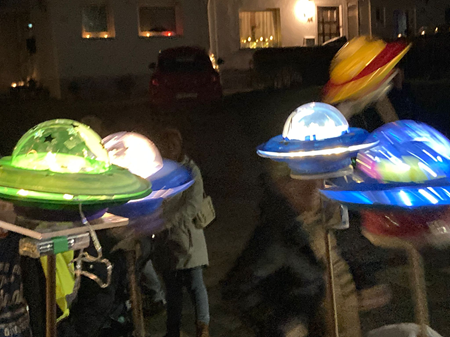 Um 17.45 Uhr sind alle Schüler/innen in der Büsdorferstraße eingekehrt, um sich auf den Martinszug vorzubereiten. Letzte Handgriffe an der Laterne wurden vollzogen, Stäbe gerichtet und Verkehrswesten verteil, ehe es dann losging. In den verschiedensten Formen und Farben erhellten die Laternen